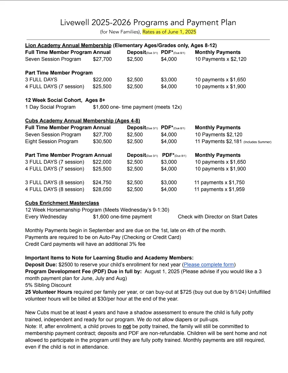 Program/Membership Fees & Rates
